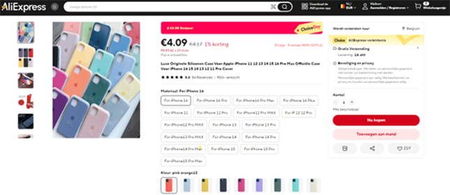 Voorbeeld van een namaakproduct gevonden op AliExpress: siliconen iPhonehoesjes worden verkocht voor ongeveer €4,00 op AliExpress, maar op de Applewebsite wordt het originele iPhonehoesje verkocht voor €59,-.