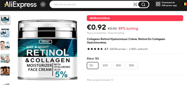 In het bovenstaande voorbeeld geeft het potje retinol- en collageencrème geen informatie over de samenstelling van de crème. Het is dus onmogelijk om de ingrediënten te controleren alvorens het product te ontvangen. Dit potje kan misschien stoffen bevatten die verboden zijn in de EU of die in China op dieren zijn getest.