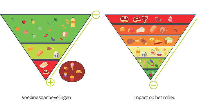 Een andere waardevolle informatiebron om je te helpen bij je voedingskeuzes is de piramide voor een gezonde voeding die is opgesteld door het Vlaams Instituut Gezond Leven. Als je de twee driehoeken hieronder goed bekijkt, zie je dat de voedingsmiddelen die de beste keuze zijn omwille van hun effect op je gezondheid en hun voedingswaarde ook vaak de kleinste impact hebben op de planeet, en omgekeerd. Dit met uitzondering van vlees.