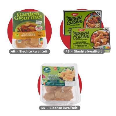 Onze test heeft 3 problematische producten geïdentificeerd. Het gaat om veggie nuggets van de merken Carrefour Sensation, Green Cuisine Iglo en Garden Gourmet. Zij behaalden een teleurstellende eindscore, minder dan 50 op 100, en belanden daarmee in de categorie "niet kopen".