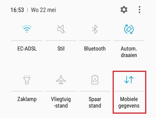 Ga naar het meldingenvenster en klik op dit icoontje om mobiele data uit te schakelen: