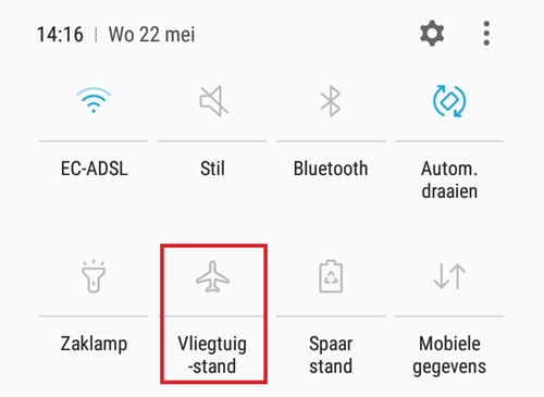 Ga naar het meldingenvenster en klik op dit icoontje om de vliegtuigstand aan te zetten: