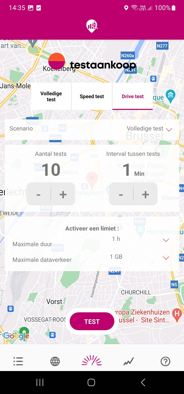Met de Drive-test kun je een reeks tests uitvoeren binnen een bepaalde tijdsperiode. Je kunt metingen uitvoeren voor een specifiek traject, zoals een treinreis van huis naar werk bijvoorbeeld.