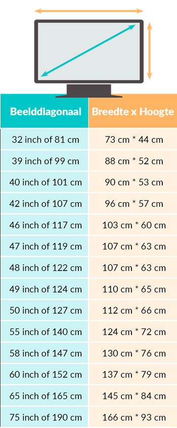 Schermafmetingen: de grootte van een tv wordt gewoonlijk uitgedrukt in inch, maar dat is louter de beelddiagonaal. Als je over een beperkt oppervlak voor de tv beschikt, is het echter belangrijk dat je ook de hoogte en de breedte kent. Deze tabel geeft de gemiddelde afmetingen voor de verschillende beelddiagonalen weer.