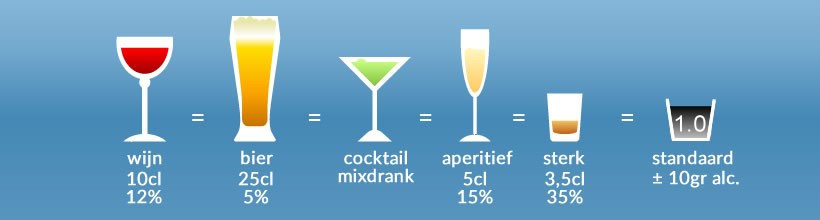 Een standaardglas bevat per alcoholische drank ongeveer 10 gram alcohol. Een standaardglas bier bevat bijvoorbeeld 250 ml, en een glas wijn 100 ml.