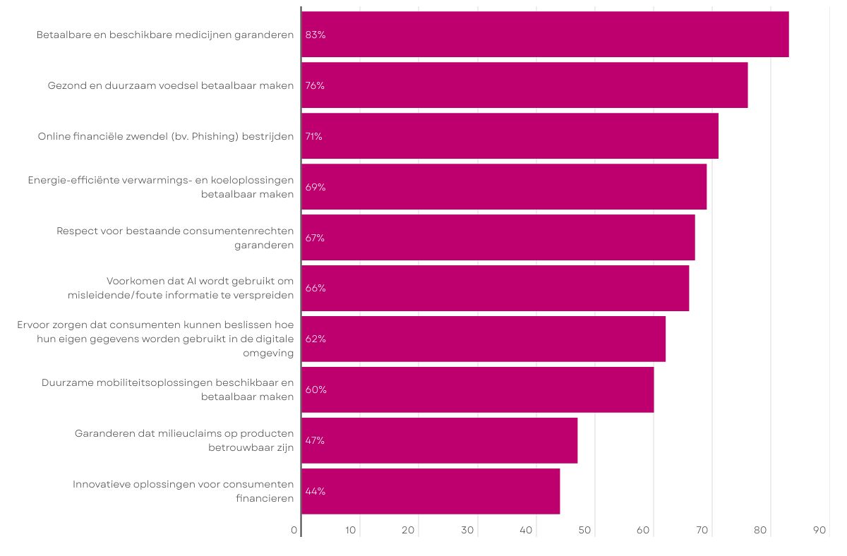 Eind maart bevroeg Euroconsumers, de consumentenorganisatie waartoe Testaankoop behoort, meer dan 4.000 consumenten in België, Portugal, Spanje en Italië over de EU en de prioriteiten voor de volgende Europese vertegenwoordigers. De top 10 staat bol van maatregelen die de koopkracht moeten verhogen, met helemaal bovenaan de betaalbaarheid van medicijnen (83% van de Belgische consumenten vindt dat de EU hier moet op inzetten) en van gezonde en duurzame voeding (76% vindt dit een prioriteit). De strijd tegen phishing vervolledigt de top 3 volgens Belgische consumenten.