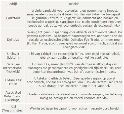 Binnen de theesector is er een wijdverspreid ethisch initiatief: het Ethical Tea Partnership. Met de bijdrage van de leden financiert men audits van de producenten. Op basis van deze audits krijgen de producenten een score die aangeeft hoeveel inspanningen ze leveren. De theemerken kunnen op die manier hun leveranciers met kennis van zaken kiezen. Helaas vallen kleinere producenten buiten dit systeem, maar dat is zeker niet het enige minpunt: het ETP is onvoldoende bindend en de audits zijn niet betrouwbaar noch transparant genoeg. Ze vinden slechts om de vier jaar plaats en worden aangekondigd. De distributiemerken ontgoochelden ons dan ook over de ganse lijn, behalve uiteraard voor hun producten met label.
