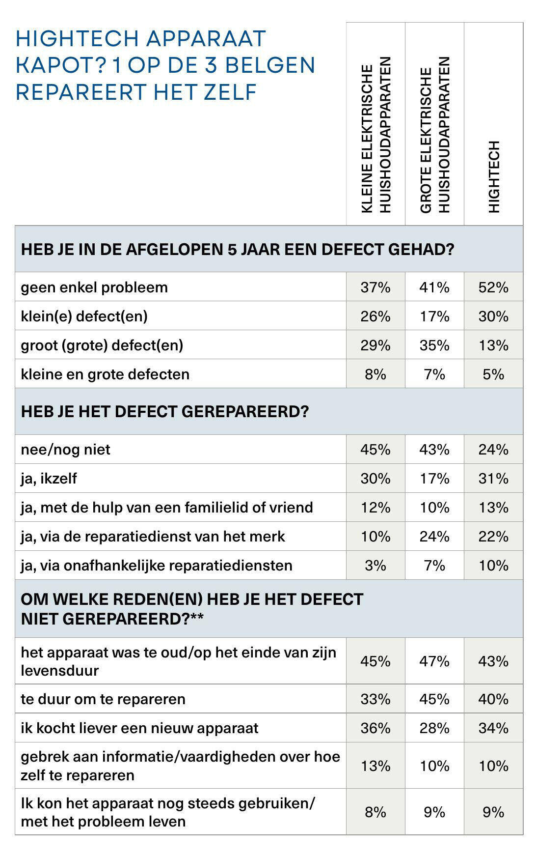 Terwijl een grote meerderheid van de respondenten in de afgelopen vijf jaar een defect bij elektrische huishoudapparaten heeft meegemaakt, komen defecten bij hightech producten minder vaak voor. De meesten hebben het defect proberen te herstellen. Ofwel zelf, in het geval van kleine elektrische huishoudapparaten of high-tech toestellen, ofwel door gespecialiseerde diensten voor grote elektrische huidshoudapparaten.