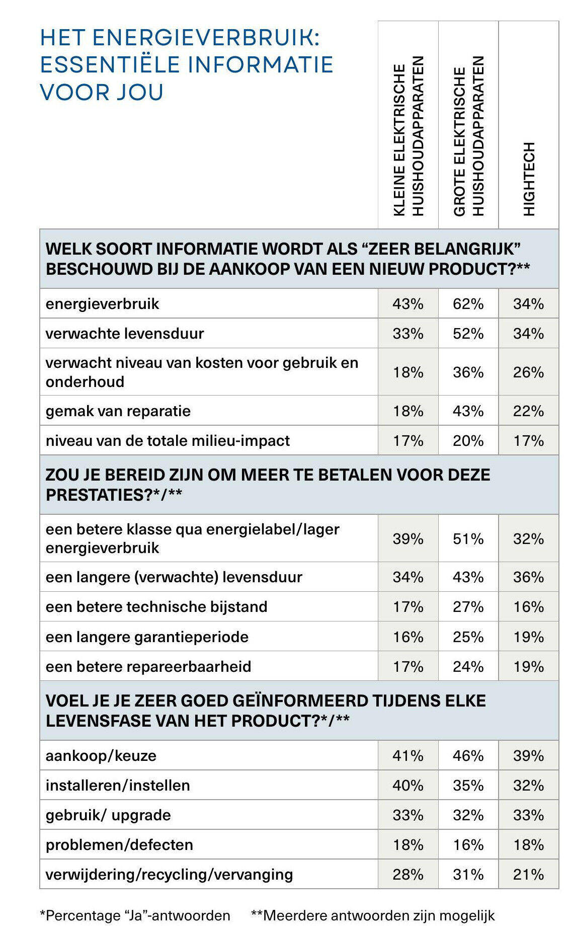 We zouden zelfs bereid zijn om meer te betalen voor een goed energielabel en een langere levensduur. Omgekeerd zou een meerderheid van de Belgen niet méér betalen voor een betere technische bijstand, een langere garantie of een betere herstelbaarheid van de producten. Ten slotte voelen de respondenten zich beter geïnformeerd wanneer ze apparaten kopen of gebruiken dan wanneer ze er pech of problemen mee hebben of ze moeten wegdoen.