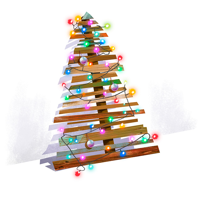 Teken een kerstboom op het pallet, zaag hem uit en zet tegen de muur. |