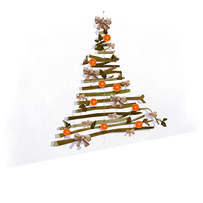 Bevestig horizontale latten van toenemende lengte aan een centrale plank (de stam). Makkelijk te demonteren en op te bergen. |