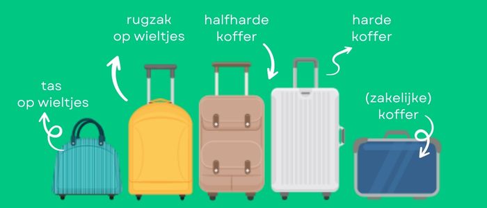 - Een harde koffer: heeft geen buitenvakken, maar biedt meer bescherming voor de spullen die erin zitten. Bovendien is deze ook regenbestendig.