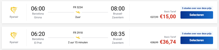 Testaankoop viseert daarnaast de vermelding “5 stoelen over voor deze prijs”, die op de website soms wordt getoond bij een vlucht met wat schijnbaar een kortingstarief is. Daardoor wordt de indruk gewekt dat consumenten snel een vlucht moeten boeken aan de promo-prijs, terwijl Testaankoop meerdere keren heeft vastgesteld dat de prijs daarna nog is gedaald.