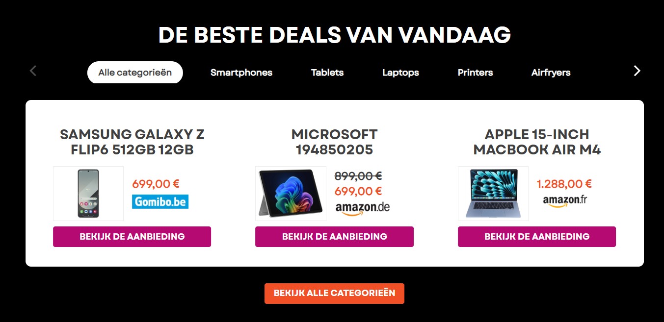 In de rubriek "De beste deals van vandaag" zetten we bepaalde productcategorieën in de kijker. Ben je op zoek naar een ander product? Klik dan op "alle categorieën" om de beste deals te ontdekken.