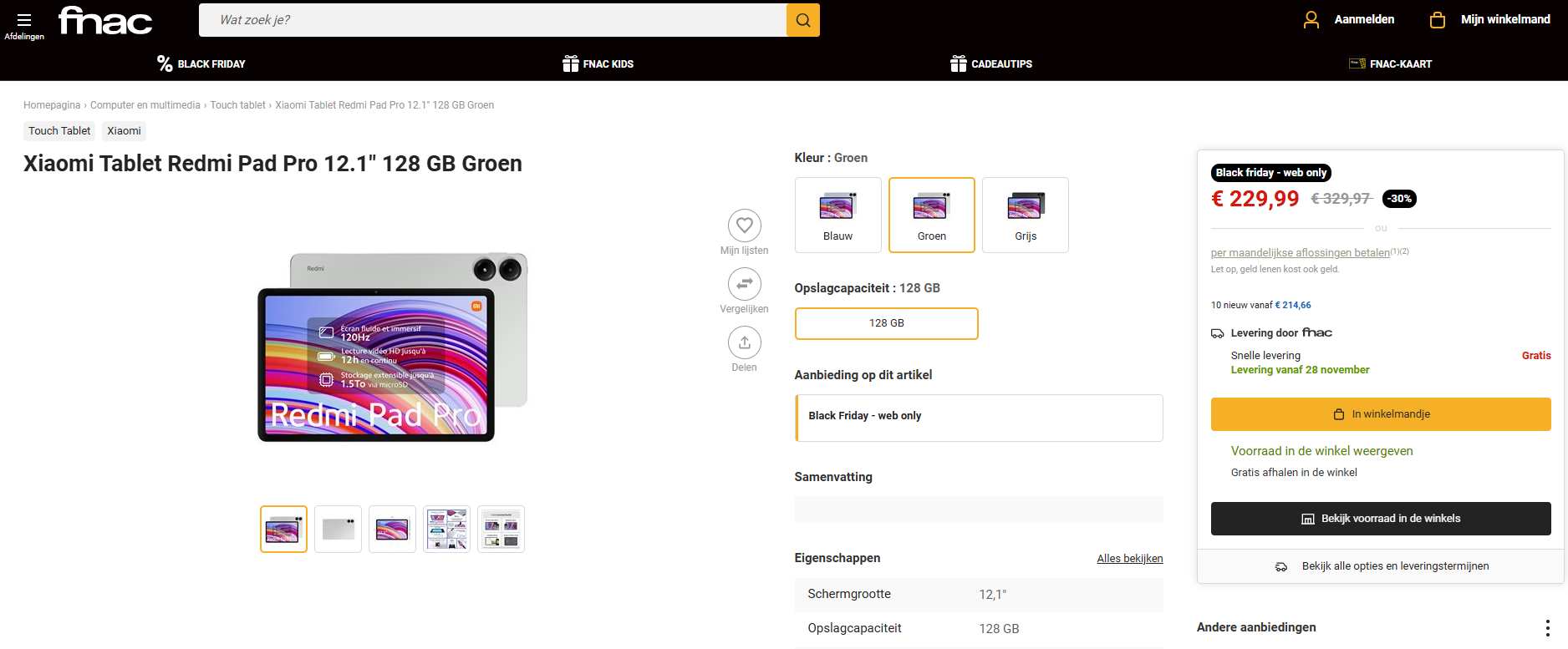 De winkel adverteert de Xiaomi Redmi Pad Pro-tablet voor € 229,99 in plaats van € 329,97, met een aangekondigde korting van 30 %. Maar ook hier is de doorstreepte prijs van € 329,97 in de afgelopen 30 dagen nooit toegepast door Fnac. De referentieprijs had € 229,99 moeten zijn – de prijs die Fnac daadwerkelijk in de afgelopen 30 dagen heeft toegepast.