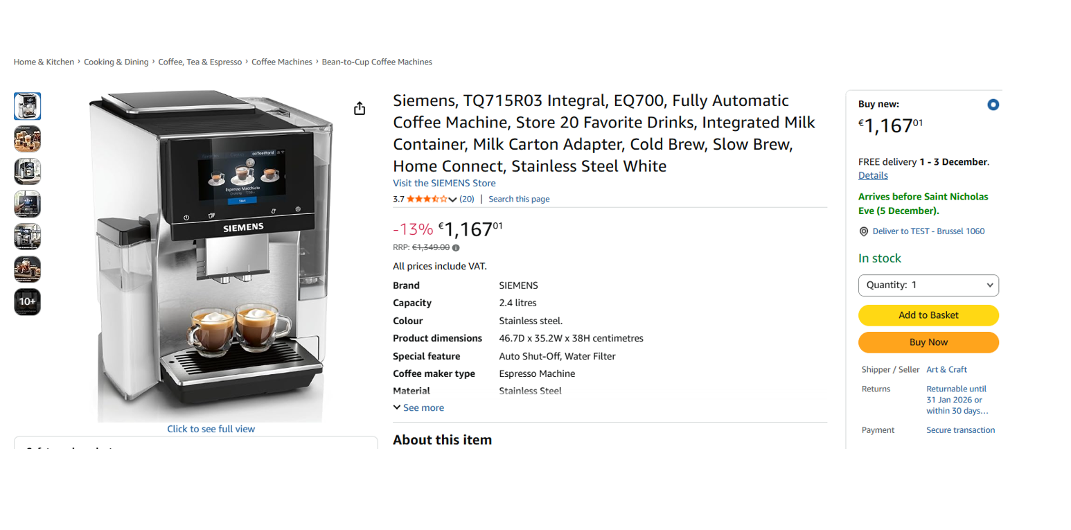 Op de Marketplace van Amazon.nl vinden we een aanbieding van Art&Craft. De verkoper biedt een Siemens-koffiemachine aan voor € 1167 in plaats van € 1349, met een aangekondigde korting van 13%.