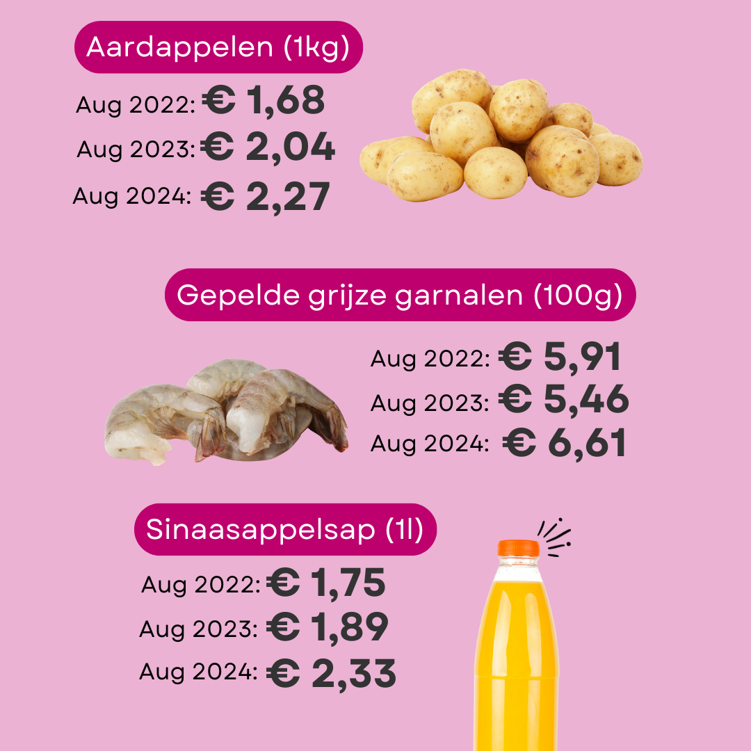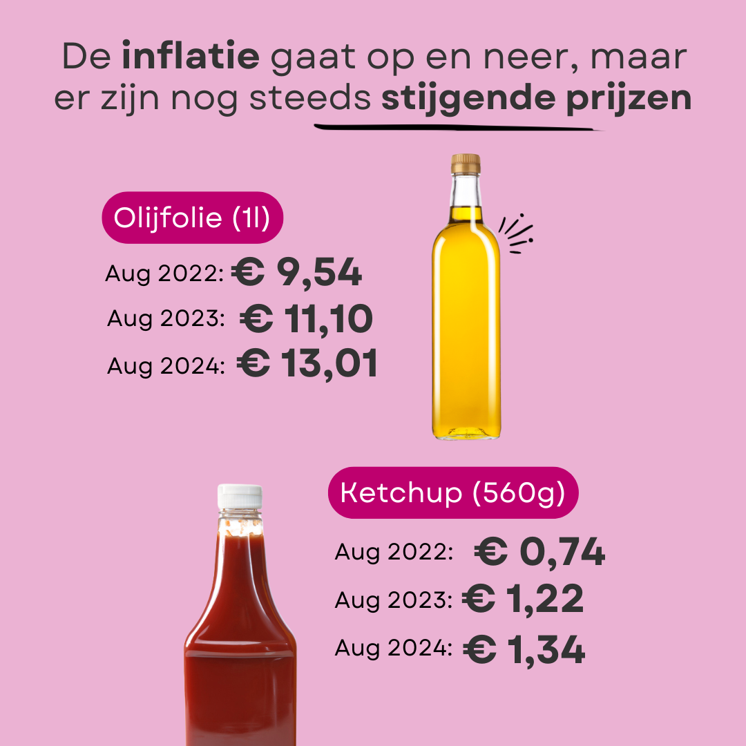 Hoewel de inflatie daalt, wijst Testaankoop erop dat de prijzen nog steeds 27% duurder zijn dan in januari 2022, de maand waarin de inflatie voor het eerst boven de 2% kwam. Ketchup is 85% duurder dan in januari 2022, olijfolie 66% duurder, aardappelen 53% duurder en grijze garnalen 42% duurder.