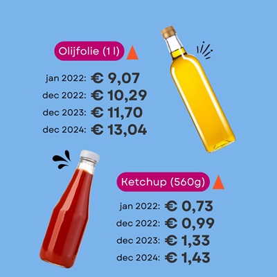 In vergelijking met januari 2022 zijn boodschappen vandaag gemiddeld 27% duurder. Ketchup is 84% duurder dan in januari 2022, mosterd 71% duurder, olijfolie 63% en ajuinen 59%.