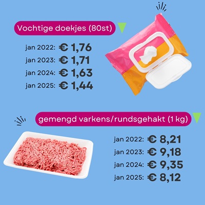 Sommige producten zijn ook gedaald in prijs ten opzichte van vorig jaar. De producten die het afgelopen jaar het meest zijn gedaald zijn varkens- en rundgehakt (-10%), frituurolie (-6%) en babydoekjes (-6%).