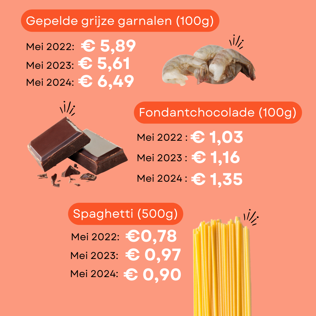 De productcategorieën die deze maand het meest bijdroegen aan de inflatie waren aardappelen (+14%), voeding voor huisdieren (+7%), alcoholvrije dranken (+5%) en producten uit de visafdeling (+5%). Vergeleken met vorig jaar werden aanzienlijke stijgingen genoteerd voor producten zoals: