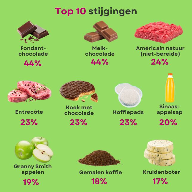 Als we kijken naar de top 10 van producten die het meest zijn gestegen, zitten daar nog steeds alle producten met chocolade: pure chocolade (+44%), melkchocolade (+44%) en chocoladekoeken (+23%). Sinaasappelsap (+20%) en koffie zitten ook nog steeds in de lift. Maar ook rundvlees: entrecote staat in de top 10 van producten die het sterkst zijn gestegen in één jaar (+23%), naast américain natuur (24%).