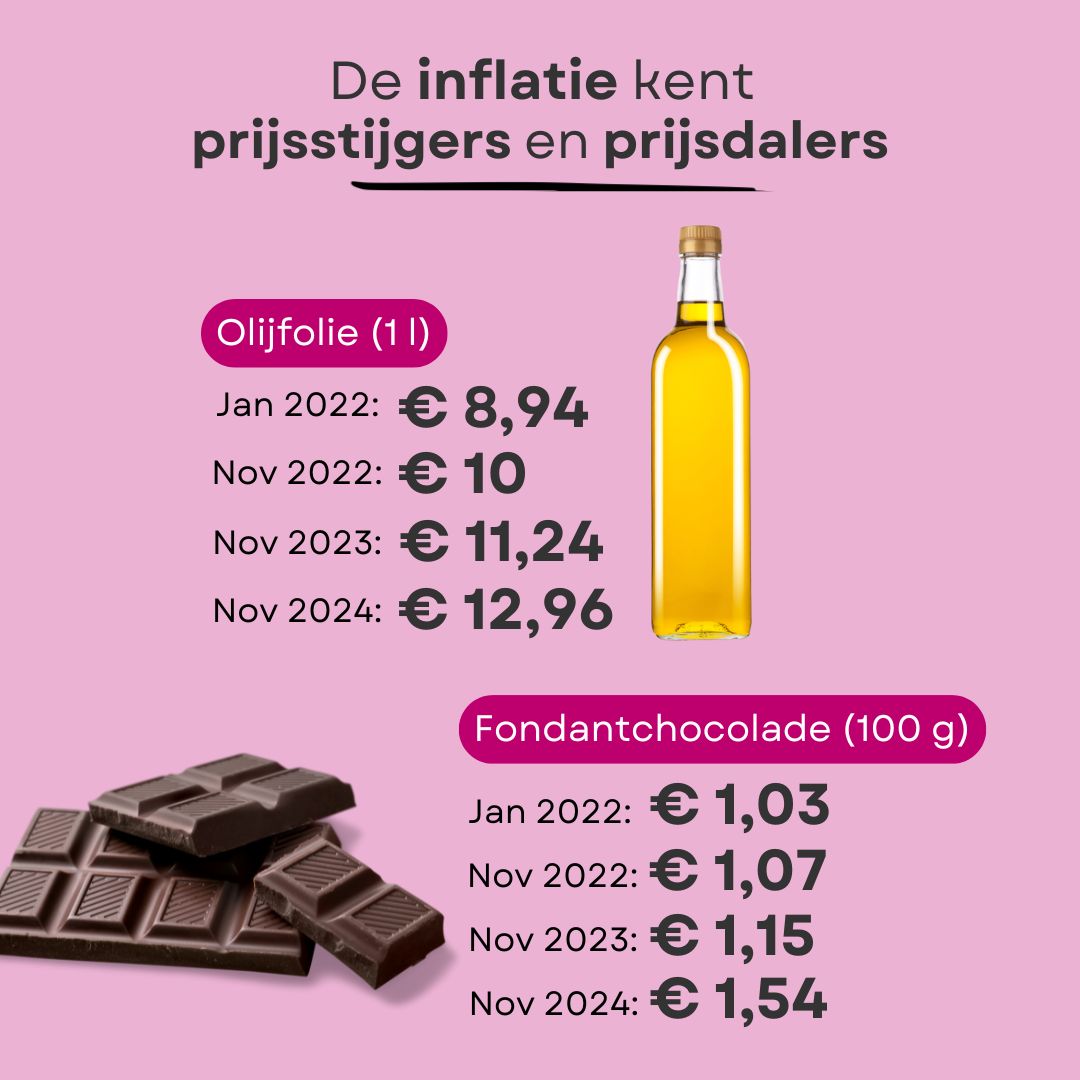 De Sint zag het al langer aankomen: chocolade is al enkele maanden best duur. De prijs schommelt rond 1,5 euro per 100 gram, daar waar die vorig jaar nog 1,15 euro was en bijna 3 jaar geleden, aan het begin van de sterke stijgingen, zelfs maar 1,03 euro. En ook olijfolie vraagt een ferme hap uit het huishoudbudget: de prijzen gaan nu gemiddeld richting 13 euro per liter, waar ze bijna drie jaar geleden nog niet eens 9 euro per liter waren.