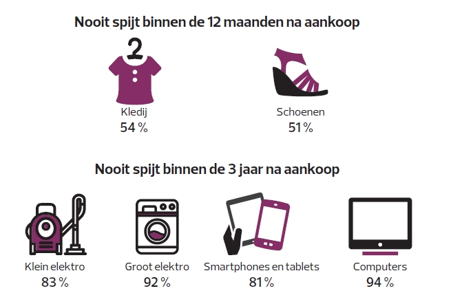 We ondervroegen zo’n 1000 Belgen over hun koopgewoonten. Onze aandacht was gericht op 6 types producten: kleding, schoenen, kleine huishoudelijke apparaten (bv. stofzuiger, microgolfoven, strijkijzer, mixer ...), grote huishoudelijke apparaten (vaatwasser, wasmachine, koelkast, diepvriezer ...), smartphones of tablets en computers. Natuurlijk kopen we de eerste meer dan de laatste, maar we stellen vast dat zogenaamde “duurzame” aankopen dat steeds minder worden.