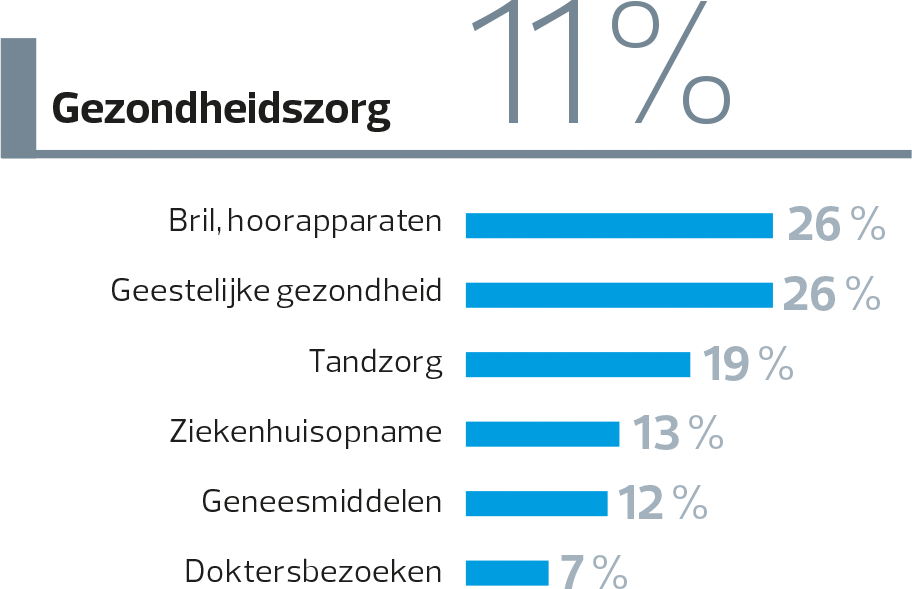 Vanzelfsprekend is gezondheidszorg voor veel ondervraagden erg belangrijk voor de levenskwaliteit van hun gezin. Toch hebben heel wat mensen moeite om bepaalde uitgaven te bekostigen, zoals een bril, een hoorapparaat, tandzorg of bezoeken aan een psycholoog. Maar liefst 34 % van de ondervraagden kan die vrij tot zeer moeilijk of niet betalen.