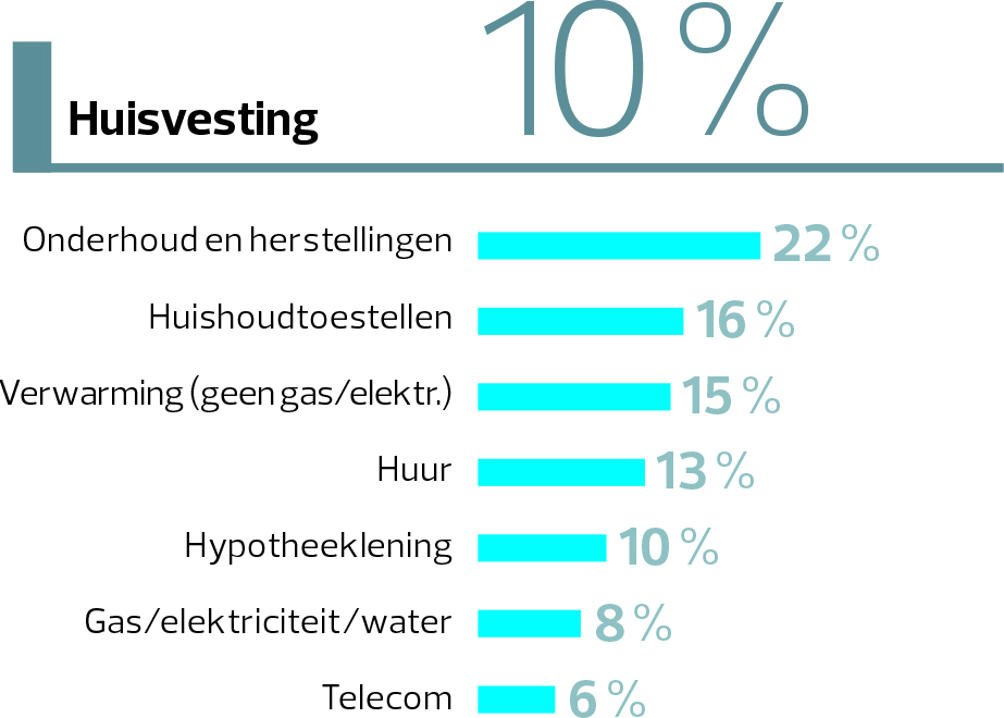 Veel mensen vinden de uitgaven met betrekking tot huisvesting heel belangrijk voor de levenskwaliteit van hun gezin. Dat is met name het geval voor de energiekosten, de huur en de afbetaling van de hypotheek. Maar 38 % van de ondervraagden krijgt het vrij tot zeer moeilijk of zelfs niet voor mekaar om die kosten te betalen.