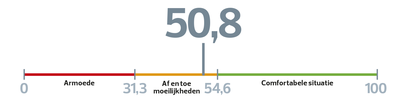 Hoe lager het cijfer, hoe meer betalingsmoeilijkheden de ondervraagden hadden in het dagelijks leven. Op basis van de gegevens die we hebben verzameld, kunnen we in ons land van armoede spreken onder indexcijfer 31,3 en van een comfortabele financiële situatie boven indexcijfer 54,6. Volgens onze enquête heeft maar liefst 5 % van de ondervraagden te kampen met een situatie van armoede binnen het gezin (rekening houdend met het aantal personen per gezin zijn 823 500 dus getroffen), hebben de meesten het af en toe moeilijk om rond te komen (56 %) en zit 39 % op rozen.