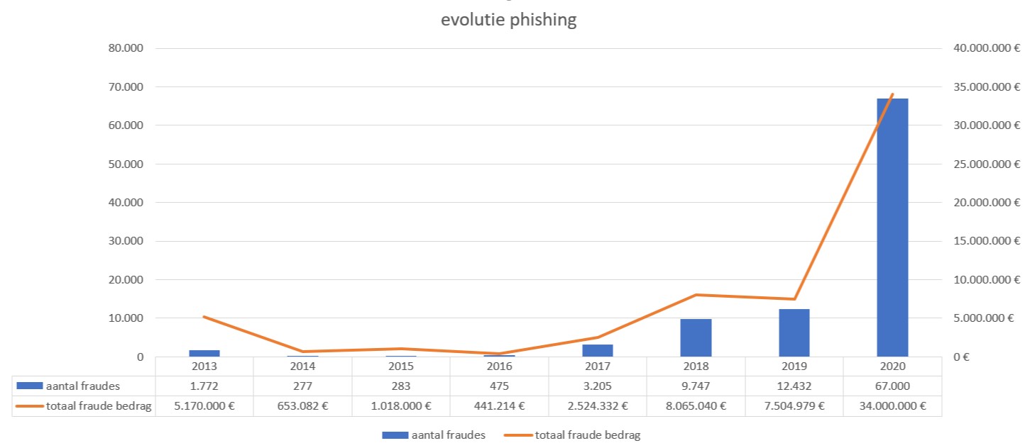 Het eerste dat opvalt, is dat Febelfin tot vorig jaar zeer precieze cijfers gaf over het aantal fraudegevallen en de bedragen die hiermee gemoeid waren (voor 2019: 12.432 gevallen en 7.504.979 euro). Dit jaar is er van deze precisie geen sprake meer, maar wordt er afgerond op tienduizenden wat betreft het aantal gevallen (67.000) en op het miljoen voor de bijhorende bedragen (34 miljoen euro).  Ondanks dit gebrek aan precisie is de vaststelling zonder meer duidelijk: het aantal fraudegevallen is tussen 2019 en 2020 meer dan vervijfvoudigd!
