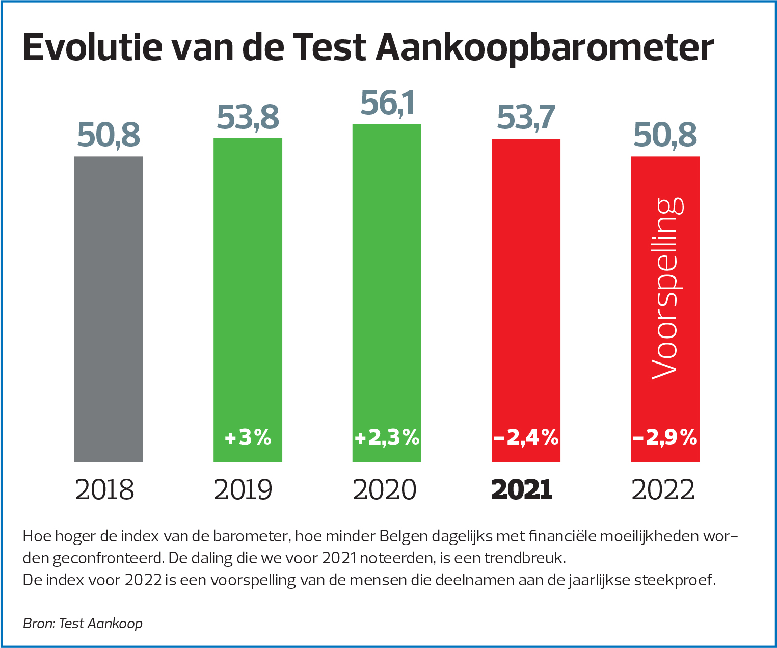 Sinds Test Aankoop startte met de consumptiebarometer, een representatieve steekproef bij zo’n 4000 landgenoten, in 2018, steeg deze elk jaar opnieuw: van 50,8 punten in 2018 tot 56,1 voor het jaar 2020. Dit jaar is er voor het eerst sprake van een daling, tot 53,7 punten om precies te zijn. Uit de bevraging die afgelopen maand december werd afgenomen, blijkt dat huishoudens het vorig jaar moeilijker vonden om voor hun producten en diensten te betalen dan in 2020.
