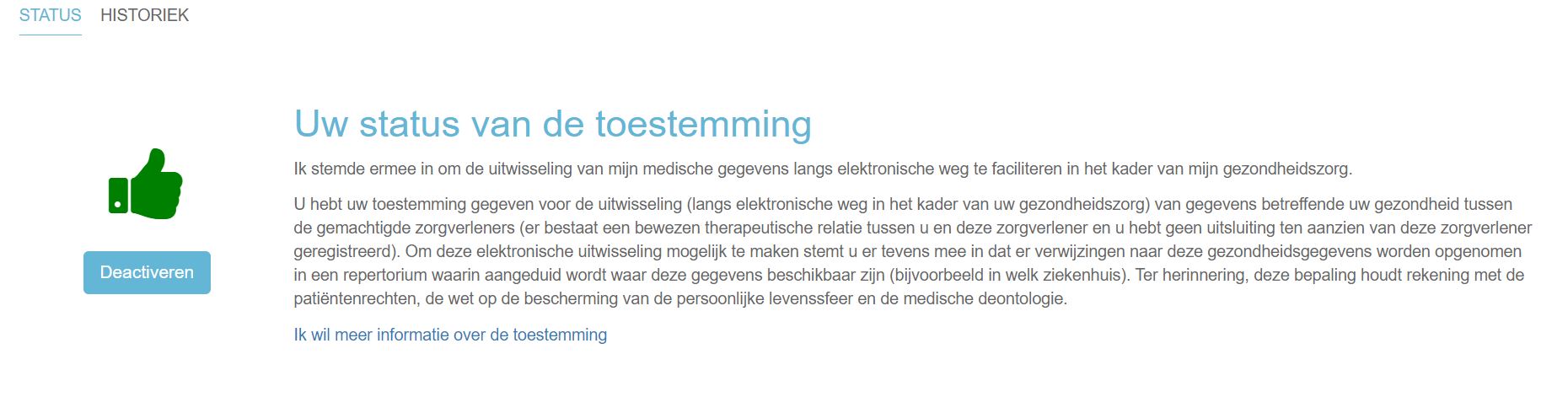 Is dat nog niet het geval dan kun je op "activeren" klikken. Via “Ik wil meer informatie over de toestemming” kan je vooraf nagaan waarvoor je je toestemming geeft. Wanneer de activering gelukt is, verschijnt er een groene duim. Omgekeerd kunt je je dossier ook zelf afschermen door op “deactiveren” te klikken. Er verschijnt dan een duim naar beneden.