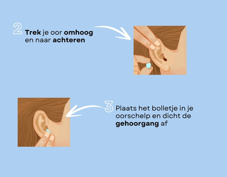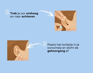 - Plaats het bolletje voorzichtig in je oorschelp en dicht de gehoorgang af door zachtjes met je vingers aan te drukken.