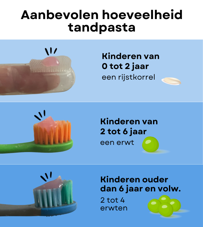 Tot de leeftijd van 6 jaar wordt tandpasta met een fluoridegehalte van 1 000 ppm (parts per million) aanbevolen. Vermijd dus: