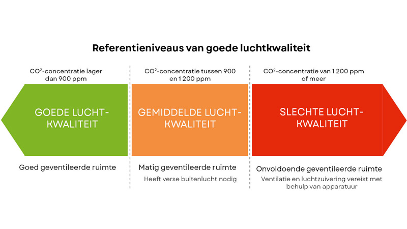 Vanaf 1200 ppm is de luchtkwaliteit in een ruimte onvoldoende en moet er effectief worden geventileerd en lucht worden gezuiverd met apparaten.