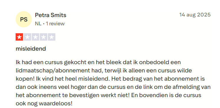 Als je op de website van NewMindStart rondkijkt, moet je trouwens opletten. Als je er ooit een programma kocht, en ze je betaalgegevens hebben, ben je één klik verwijdert van een duur all-inclusive abonnement ($ 89 per maand!). Dat schiet automatisch in gang na een proefperiode van zeven dagen. De bestelknop voldoet niet aan de wetgeving. De reviews op Trustpilot bewijzen hoe vaak consumenten per ongeluk een abonnement aankopen (wij hadden dit ook voor ...). Dit abonnement annuleren kan niet online. Je moet hiervoor contact opnemen met de klantendienst.