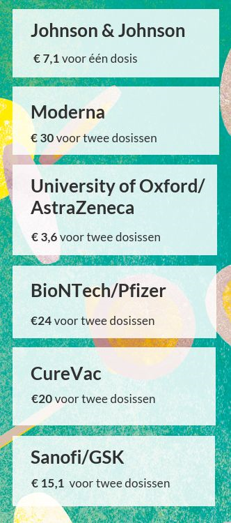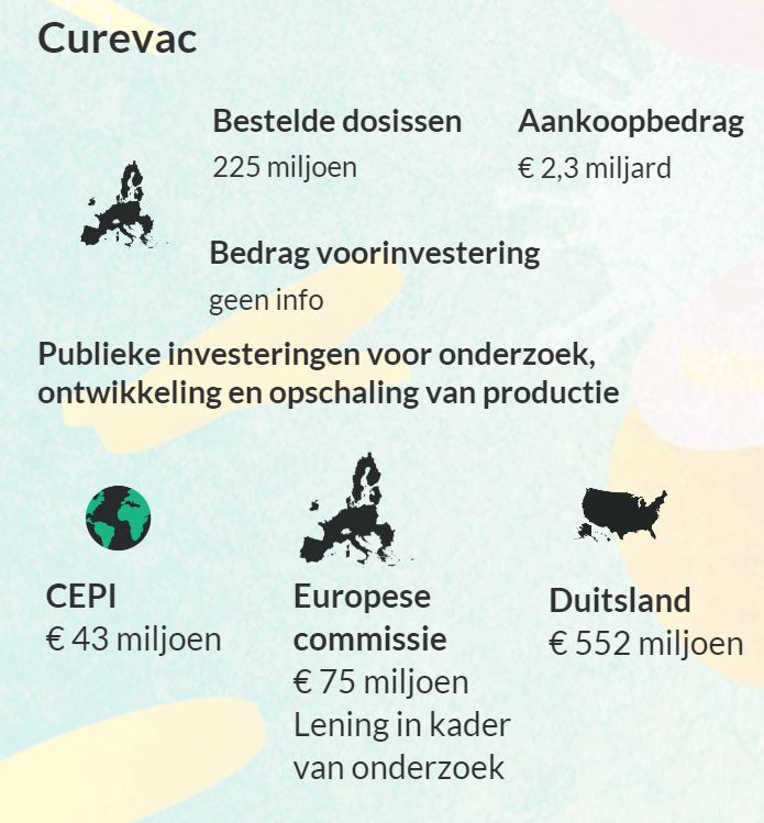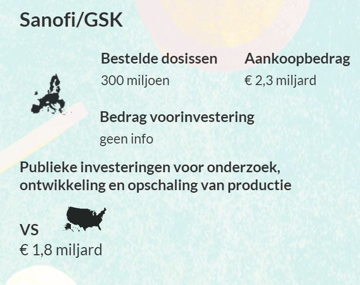 - Voorinvesteringen: In totaal is er al zo’n 2,7 miljard euro naar de firma’s is gevloeid als voorinvestering. Of het dan zo is dat de duurste vaccins hier een kleiner aandeel in hebben gehad of vooral meer winst opstrijken, blijft nu koffiedik kijken.