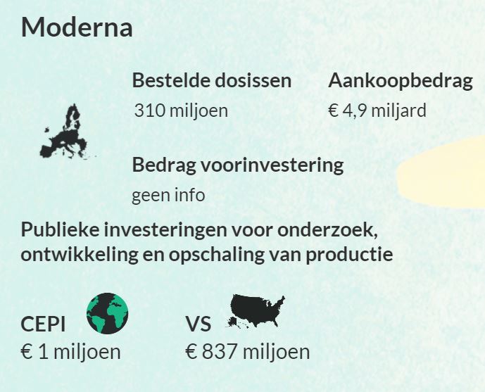 Een ander extreem voorbeeld van dergelijke publieke investeringen is het kandidaat-vaccin van Moderna, dat voor een flink stuk door de Amerikaanse belastingbetaler werd gesponsord. Het bedrijf werkt al enkele jaren rond onderzoek naar de nieuwe vaccin- en geneesmiddelentechnologie mRNA. Daarvoor kreeg het de afgelopen jaren van internationale en Amerikaanse organisaties al miljoenen subsidies. Voor de ontwikkeling van hun coronavaccin, dat gebaseerd is op deze technologie, konden ze dus profiteren van deze publiek gefinancierde kennis uit het verleden. Hun coronavaccin werd overigens mee ontwikkeld door onderzoekers van het publiekgefinancierde National Institute of Health en de preklinische en klinische studies werden quasi volledig gefinancierd door de Amerikaanse overheid. Deze legde hiervoor zo’n 836 miljoen euro op tafel.
