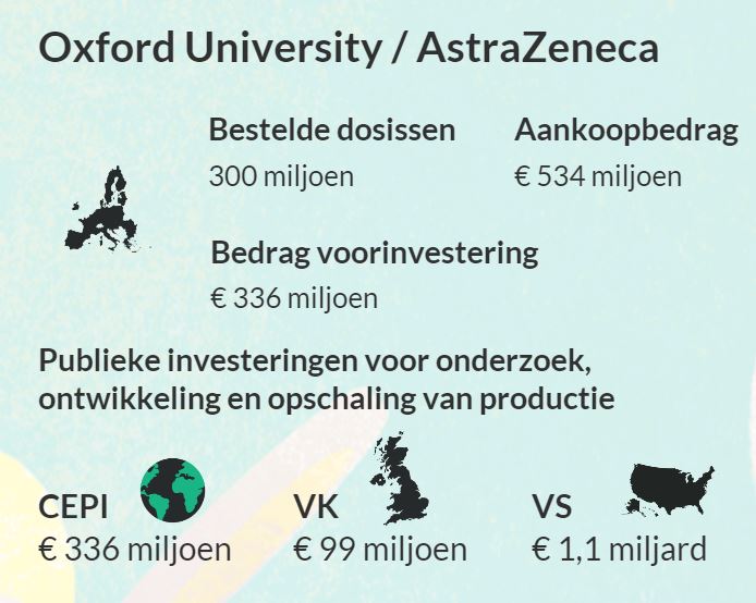 In Europa worden de contracten grotendeels geheim gehouden. Hoeveel geld er van Europa naar iedere firma vloeit en welke voorwaarden aan die financiering gekoppeld zijn, blijft dus koffiedik kijken. Maar uiteraard pompen ook elders in de wereld overheden massaal geld in deze vaccins, vooral in de Verenigde Staten. Zij communiceren wel iets opener, en publiceren de toegekende bedragen, alsook in grote lijnen waarvoor deze worden gebruikt. Hieronder een overzicht van de investeringen voor de koploper-vaccins.