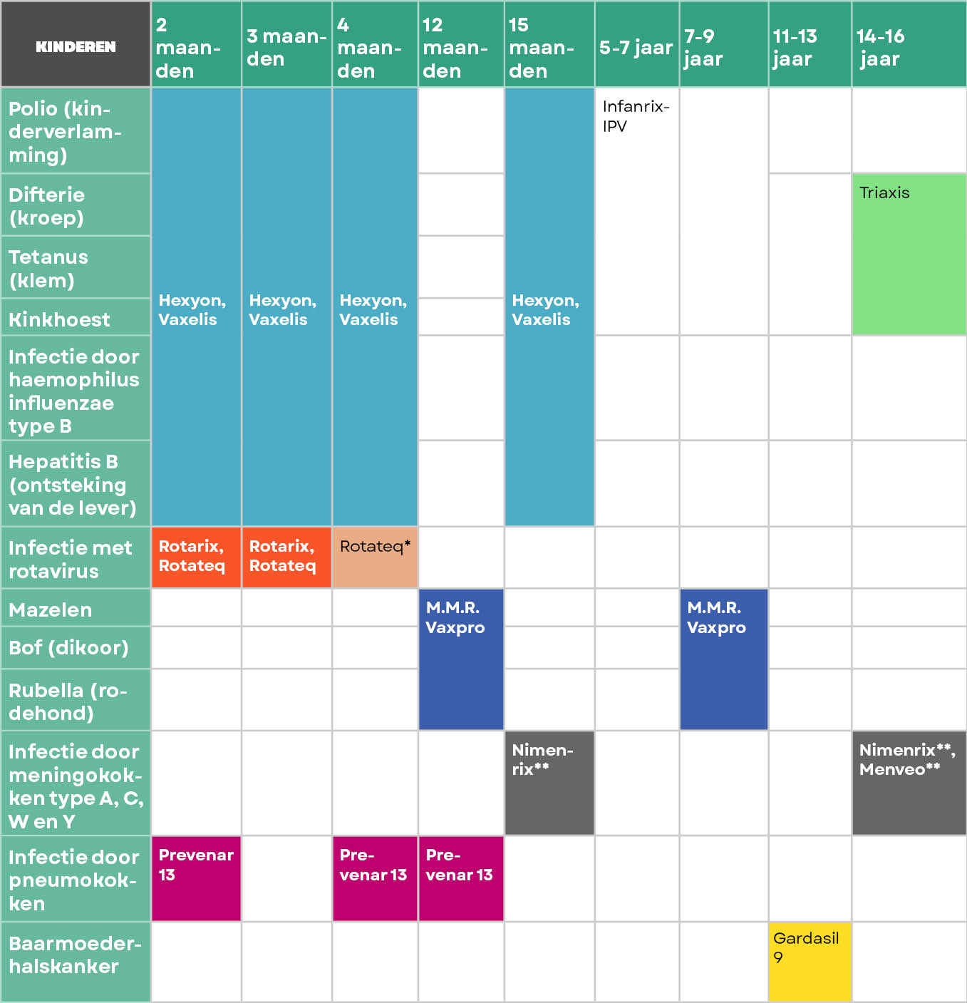 Omdat kinderen vatbaar zijn voor andere infectieziekten bestaat er een apart schema voor volwassenen.