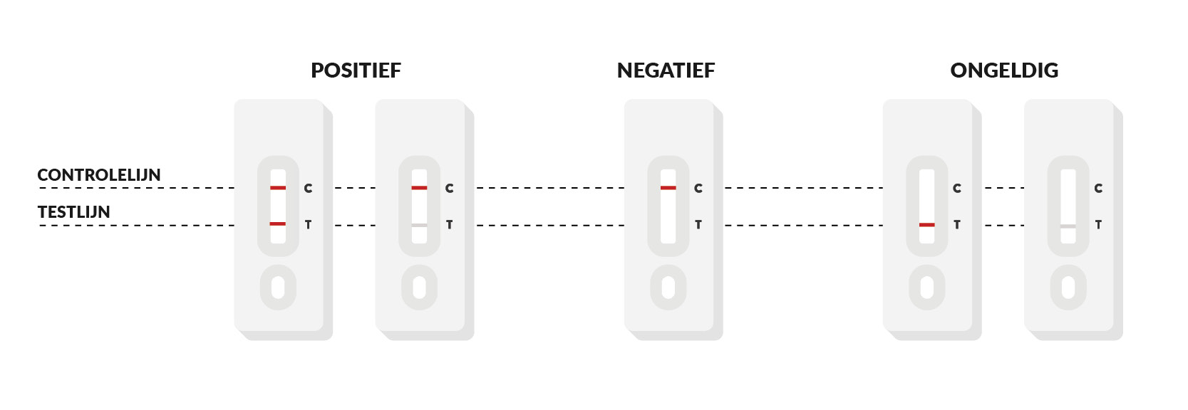 - Zie je enkel een gekleurde Controle band, dan is het resultaat negatief. Deze Controle band geeft aan dat de testprocedure vanaf het moment van het aanbrengen van de vloeistof op de cassette correct verlopen is (oa dat er voldoende staal is aangebracht). Of de staalname en het aanbrengen van de wisser in de vloeistof correct verlopen zijn, wordt echter niet gecontroleerd. Een negatieve test geeft echter geen 100% zekerheid dat je niet besmet bent met SARS-CoV-2. Hoe dat komt, lees je in op deze pagina.
