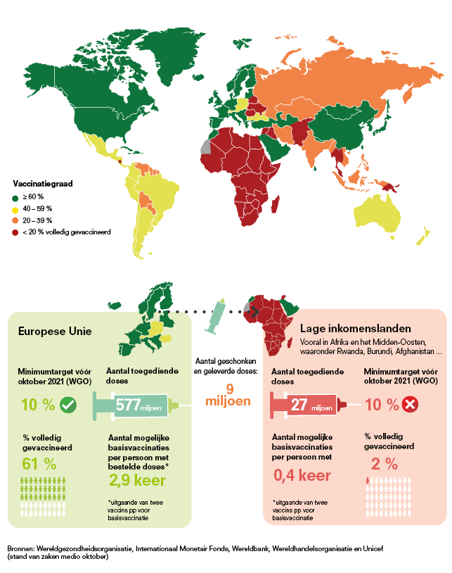 Helaas viel deze oproep in dovemansoren. Heel wat landen beloofden hun steun voor een rechtvaardigere verdeling van de vaccins, maar beslisten uiteindelijk toch om de vaccins zelf te gebruiken. Eerst voor de inenting van tieners, die zelf weinig risico lopen op ernstige gezondheidsproblemen. Vervolgens om een extra prik te geven aan bepaalde groepen op een moment dat er nog onzekerheden bestonden over het nut ervan.