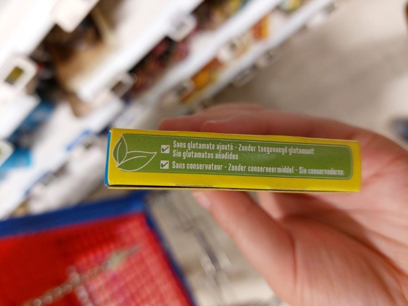 Op de verpakking van Carrefour's bouillonblokjes met groentesmaak staat de claim "geen glutamaat toegevoegd". In de ingrediëntenlijst staat echter gistextract, dus dit product bevat vrijwel zeker glutamaat.