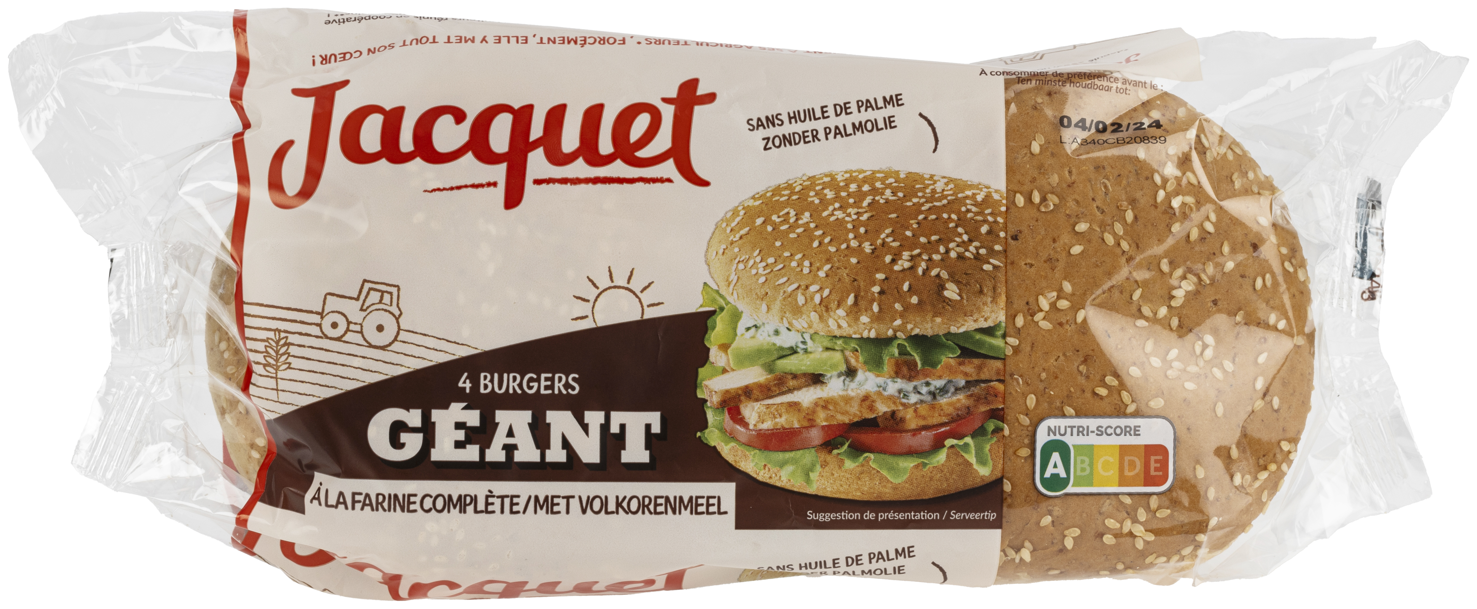 Op de verpakking van de hamburgerbroodjes van het merk Jacquet staat "met volkorenmeel". Uit ons ingrediëntenonderzoek in 2019 bleek dat er slechts 12,5 % volkorenmeel gebruikt werd en 47 % geraffineerde tarwemeel.
