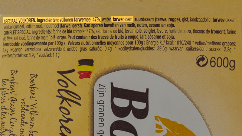 Niettemin vonden we het jammer dat dit percentage of het percentage witte tarwebloem niet duidelijk werd meegedeeld aan de consument. Enkel het percentage van volkoren tarwemeel in het uiteindelijke volledige product was vermeld (47 %) en dus niet het percentage volkorentarwemeel (86 %) ten opzichte van de hoeveelheid bloem.