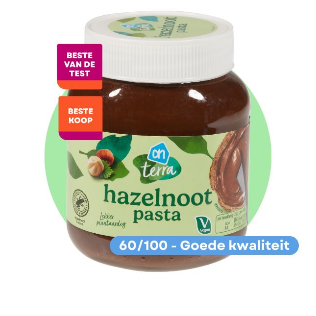 Deze plantaardige hazelnootpasta met cacao van het Albert Heijn-huismerk scoorde bij een smaaktest ongeveer even goed als het bekende merk Nutella Plant-based. Zo goed zelfs dat 7 van de 10 testers aangaven het product opnieuw te willen eten.