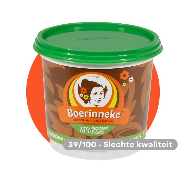 De hazelnootpasta van Boerinneke stelde de testers teleur door een te vaste structuur, een te korrelige textuur en een te flauwe hazelnootsmaak. In combinatie met de slechte resultaten voor MOSH- en MOAH- vervuiling (stoffen uit minerale olie) eindigt Boerinneke jammer genoeg helemaal onderaan met een score van 39/100. Deze smeerpasta wordt dus afgeraden.
