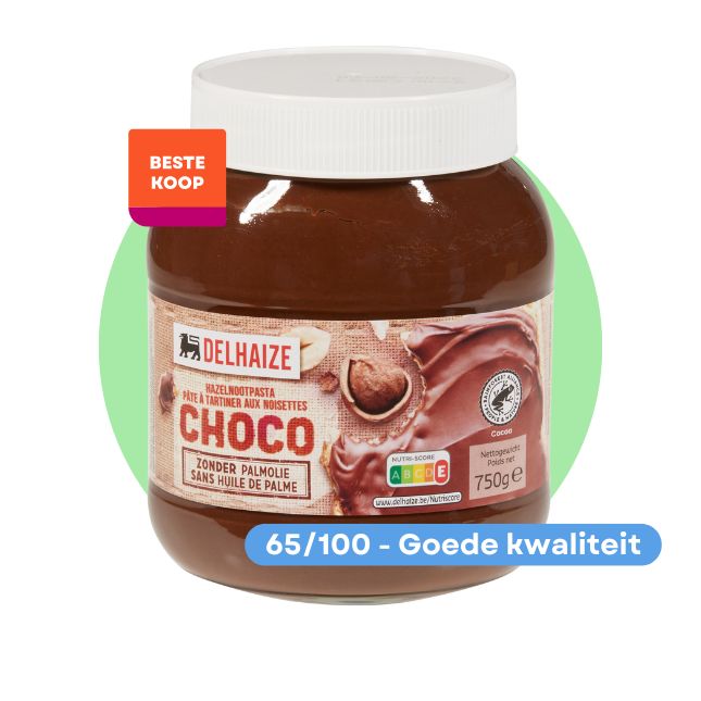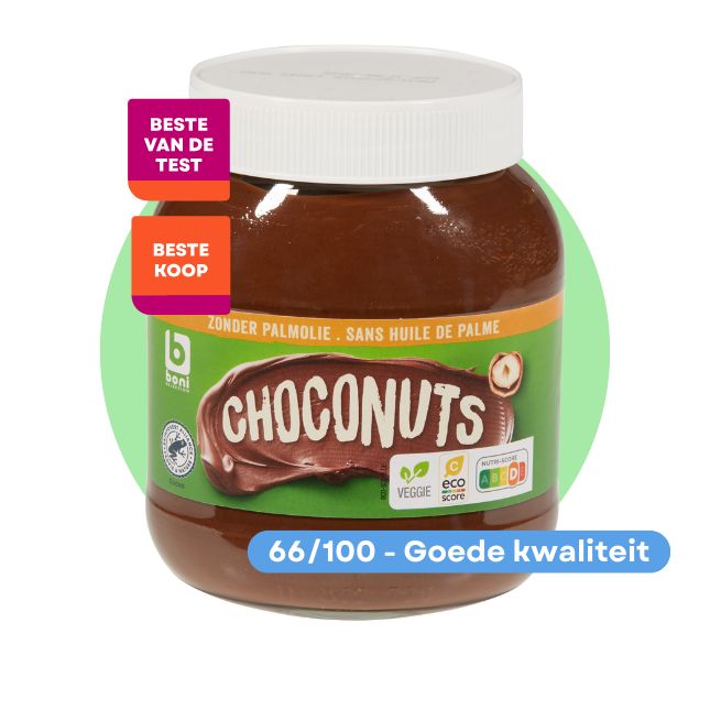 De hoogste score van de test gaat naar een huismerk-hazelnootpasta van Colruyt, Boni Selection Choconuts zonder palmolie: 66/100. Het product kreeg zowel het label Beste koop als Beste uit de Test.