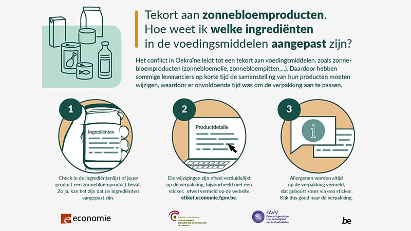 Omdat zonnebloemolie door het conflict in Oekraïne moeilijker bij voedingsbedrijven geraakt, zal je in de supermarkt binnenkort affiches zien hangen met informatie over mogelijke wijzigingen in samenstelling van producten met zonnebloemderivaten. De supermarkten moeten die affiches op goed zichtbare plaatsen hangen.